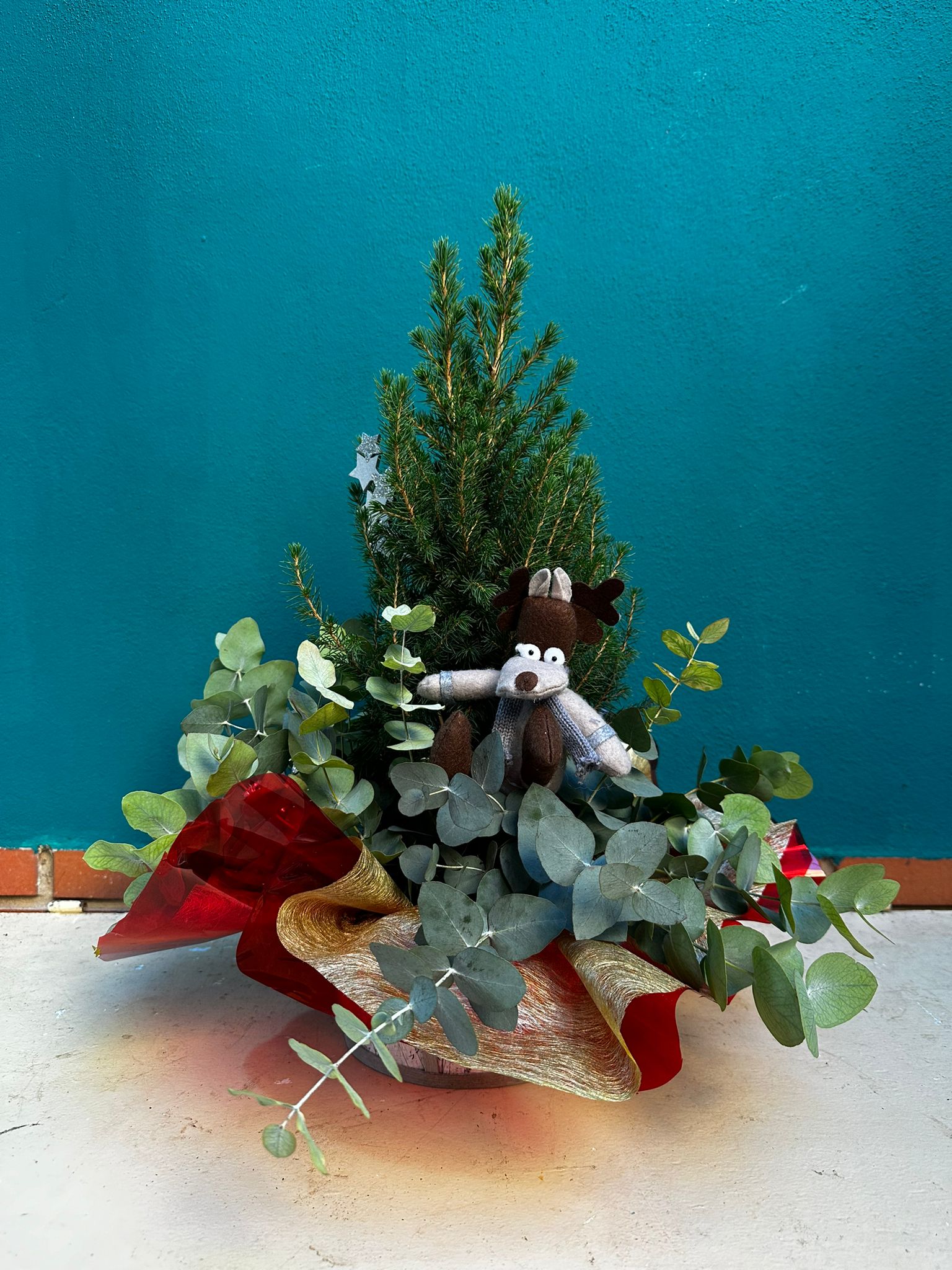 El diseño se completa con un encantador muñeco reno y un envoltorio en tonos rojos y dorados que aporta un toque cálido y festivo, típico de la Navidad. Todo el arreglo está montado a mano por nuestros floristas y pensado para destacar en mesas, recibidores y rincones especiales.