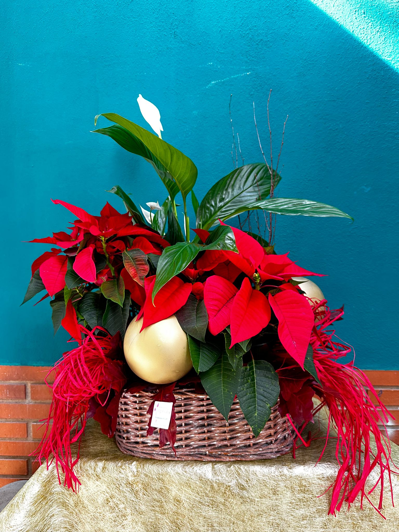 La Cesta Imperial Navideña – 70 cm es un arreglo espectacular y elegante, diseñado para destacar en cualquier espacio durante las fiestas. Elaborada a mano en nuestra floristería de Málaga, combina flores de Pascua rojas de gran tamaño, un spathiphyllum (cuna de Moisés) que aporta altura y elegancia, ramas naturales y adornos dorados de gran presencia que realzan su estilo festivo.