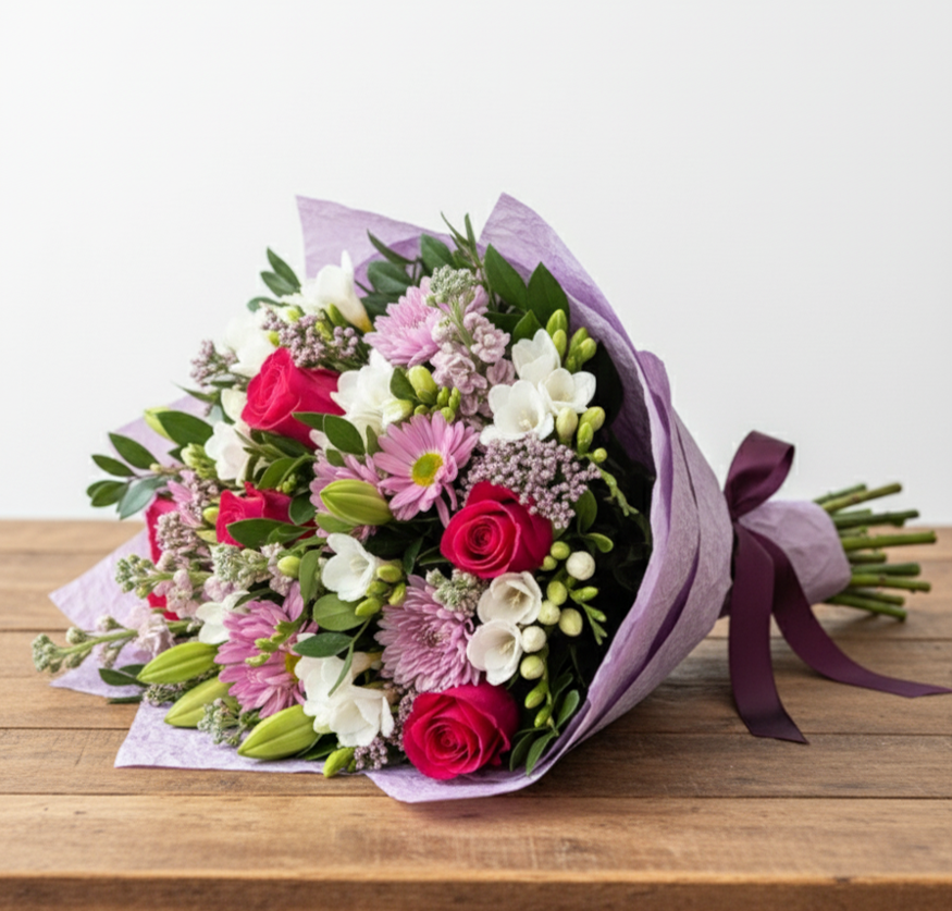 Un ramo vibrante que reúne la pureza del blanco, la dulzura del rosa, la serenidad del lila, la pasión del rojo y el frescor del verde. Decorado con un elegante papel lila, este arreglo es una invitación a sumergirse en un jardín de emociones y matices, donde cada flor cuenta una historia única. 🌸💜🌹
